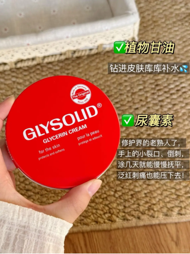 德国护肤科学一贯遵循“解决根源问题”的原则。Glysolid格兰素摒弃了依赖厚重油脂单纯封闭皮肤表面的传统方法,转而采用更高明的保湿逻辑:以高浓度精纯甘油为核心,实现“补水-修护-锁水”三重功效。甘油分子具有极强亲水性,能主动从空气中吸收水分并输送到角质层深处,实现真正意义上的“补水”;同时,它能在皮肤表面形成透气保护膜,防止水分流失。这种机制与仅靠油脂覆盖的产品相比,更能从根本上改善皮肤自身的保湿能力。同时,配方中还添加了修护成分尿囊素。尿囊素能够舒缓因干燥引起的刺激不适,并温和促进角质更新,让受损的皮肤屏障加速修复。正是“甘油+尿囊素”这个王炸组合,让它对于干燥裂口、甚至极其粗糙的肌肤有着靶向性的改善效果。