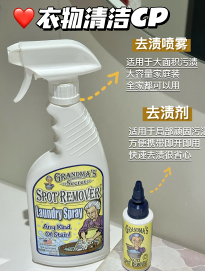 “奶奶的秘密(Grandma’s Secret)”衣物去渍剂配方很能打,能钻进衣物纤维里,不管什么顽固污渍,如火锅油渍、领口汗渍等,都能轻松搞定。